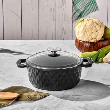 - Hochwertiger Aluguss-Topf mit Glasdeckel – Der 26 cm Taç Bella Gusseisen-Flachtopf in Schwarz bietet ein elegantes Design und gesunde Kochmöglichkeiten. Dank der robusten Granitbeschichtung und der PFoA-freien Materialwahl ist sie langlebig und sicher in der Anwendung.